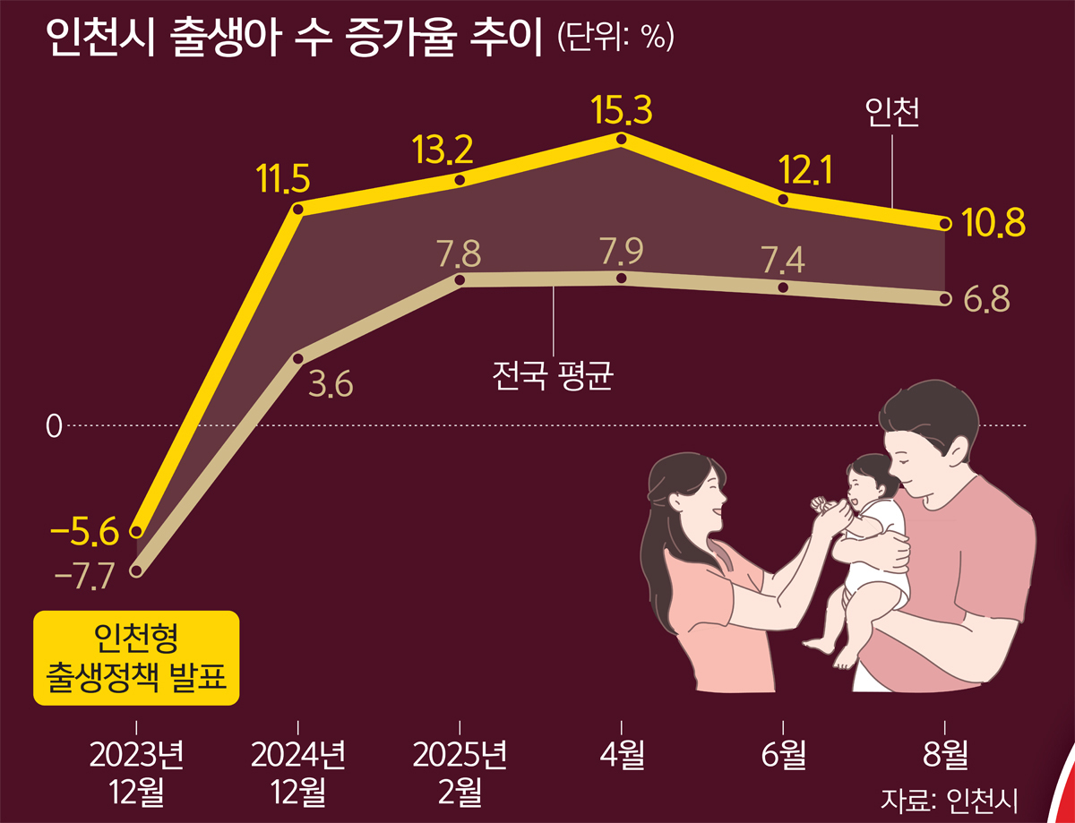 이런 차별화된 시도의 성과는 수치로도 증명된다. 19일 통계청에 따르면 2025년 1∼7월 인천 출생아 수는 9638명으로 지난해 동기보다 11.9% 증가했다. 조출생률(인구 1000명당 새로 태어난 사람 비율)은 4.6명에서 5.1명로 10.9% 상승했고 합계출산율(여성이 가임기간 낳을 것으로 기대되는 평균 출생아 수) 역시 9.8%(0.69→0.76) 늘었다. 올해 초 인천 주민등록인구는 광역시 가운데 유일하게 플러스 성장세를 보이기도 했다.