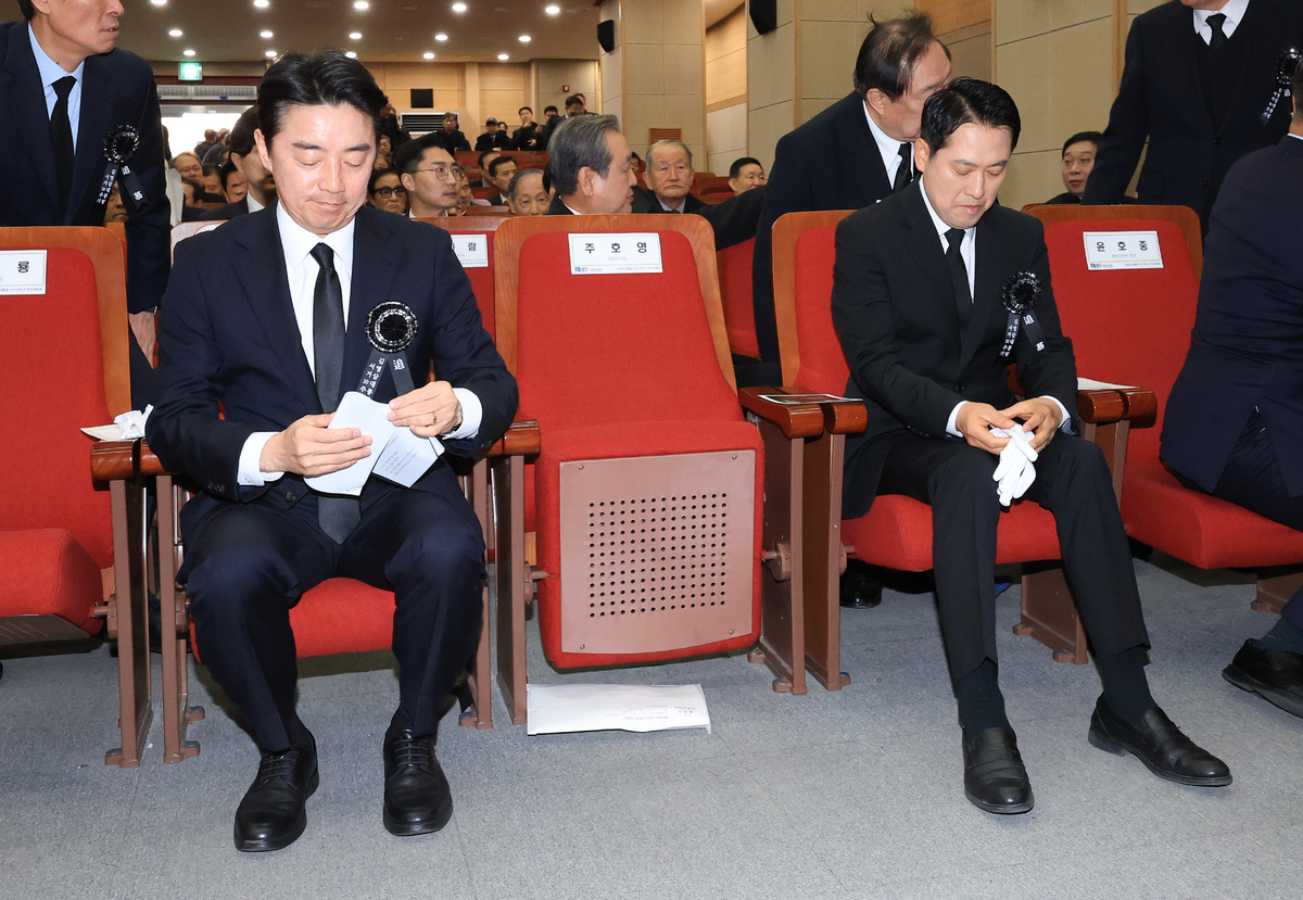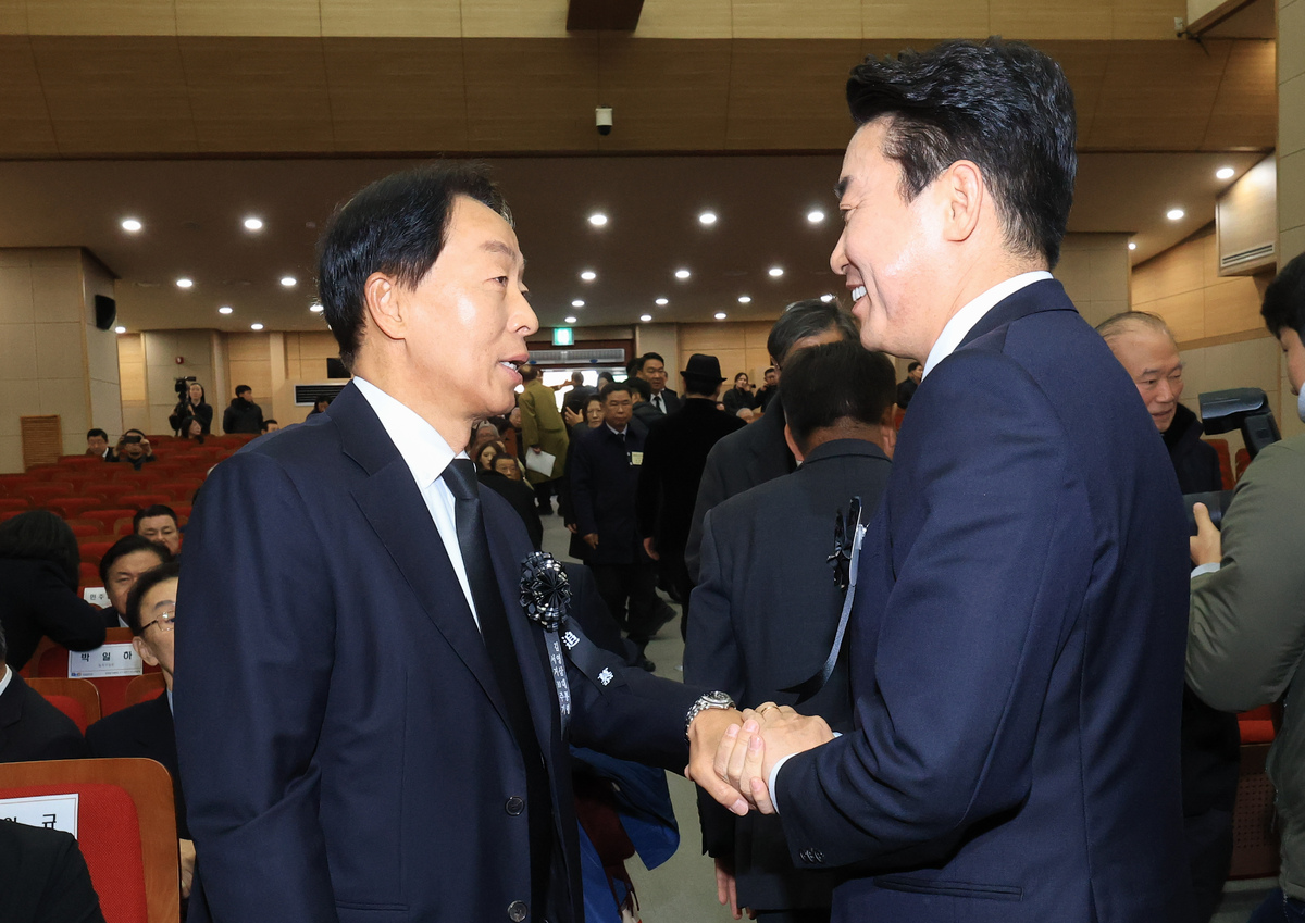 21일 서울 동작구 국립서울현충원에서 김영삼 대통령 서거 10주기 추모식이 열린 가운데 강훈식 대통령실 비서실장, 국민의힘 장동혁 대표 등 정치권 인사들이 참석해 김 전 대통령에 대한 예를 표했다.