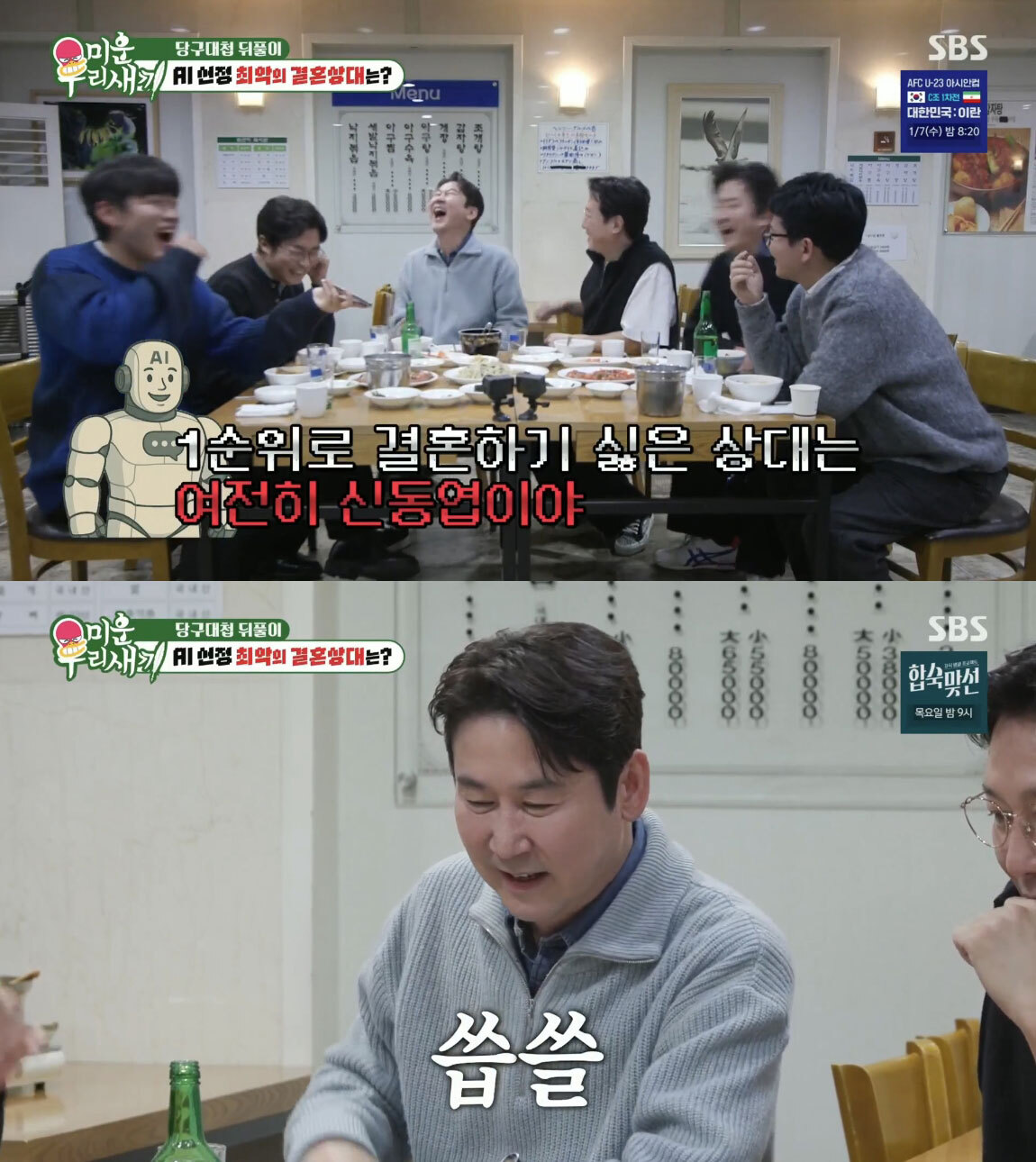 연이어 1위로 꼽히자 신동엽은 “AI 기술이 아직 멀었다. 갈 길이 멀다”며 웃으며 반응했다. 반면 안재욱은 5순위로 평가되자 “우리 와이프가 들으면 한숨을 쉬겠다”고 말해 웃음을 자아냈다.
