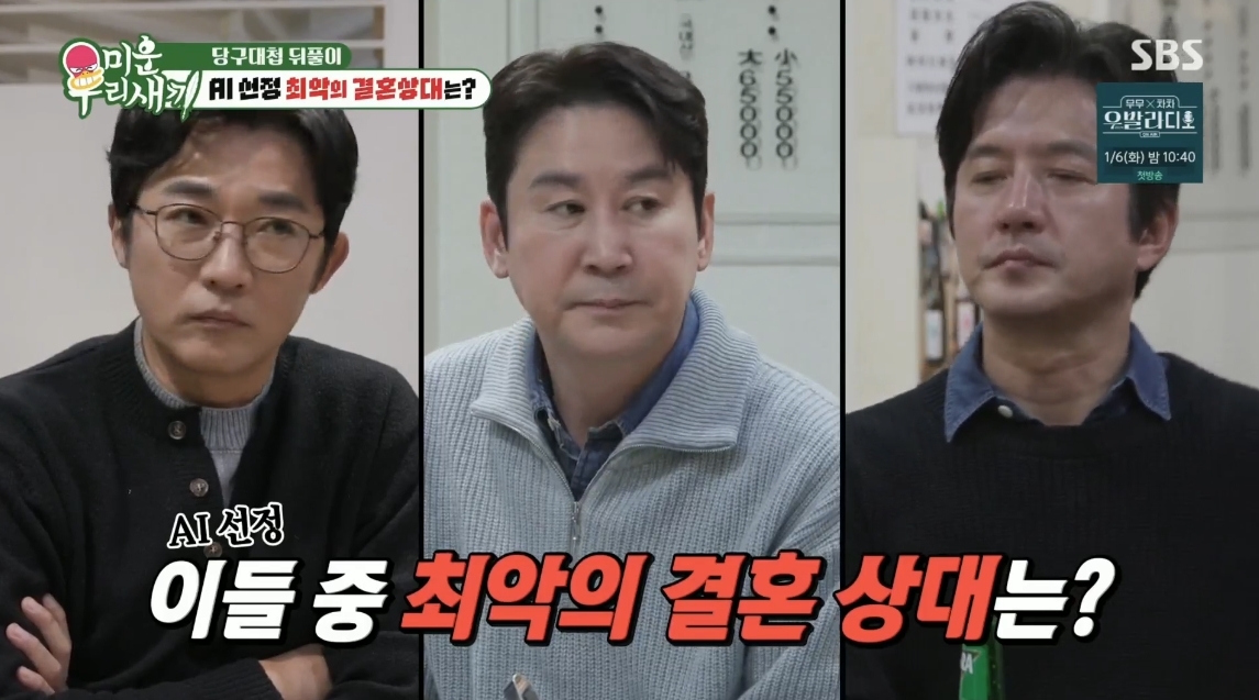 AI의 선택은 신동엽이었다. AI는 신동엽을 최악의 결혼 상대 1순위로 꼽으며 “유흥스럽고 자유분방한 이미지가 강해서 안정적인 결혼생활과는 거리감이 있다”는 취지로 이유를 설명했다. 정준호에 대해서는 “인맥과 외부 활동이 많아서 가정보다 사회적 관계를 우선시할 가능성이 높다”며 2순위로 언급했다. 마지막으로 3순위에 안재욱을 선정하며 “이 셋 중에서는 상대적으로 가정적이고 안정적인 편이라 가장 덜 꺼려지는 선택지다”라고 평가했다.